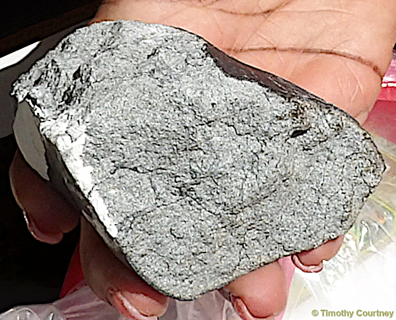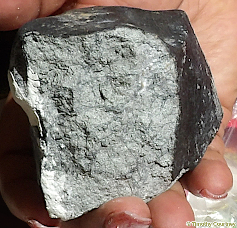 Then Sherrie showed me the burnt crust of her new found meteorite. The rock had long straight scratches on it, which indicate the speed and force at which impact happened. This is a very hard substance and it's not easy to create those marks. The dings and scuffs on it only added more character to this treasure.
