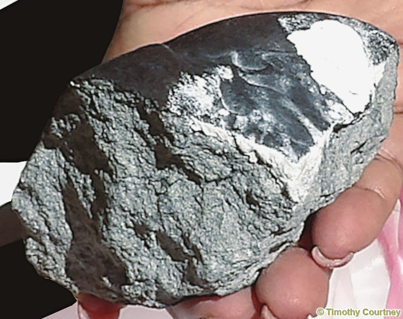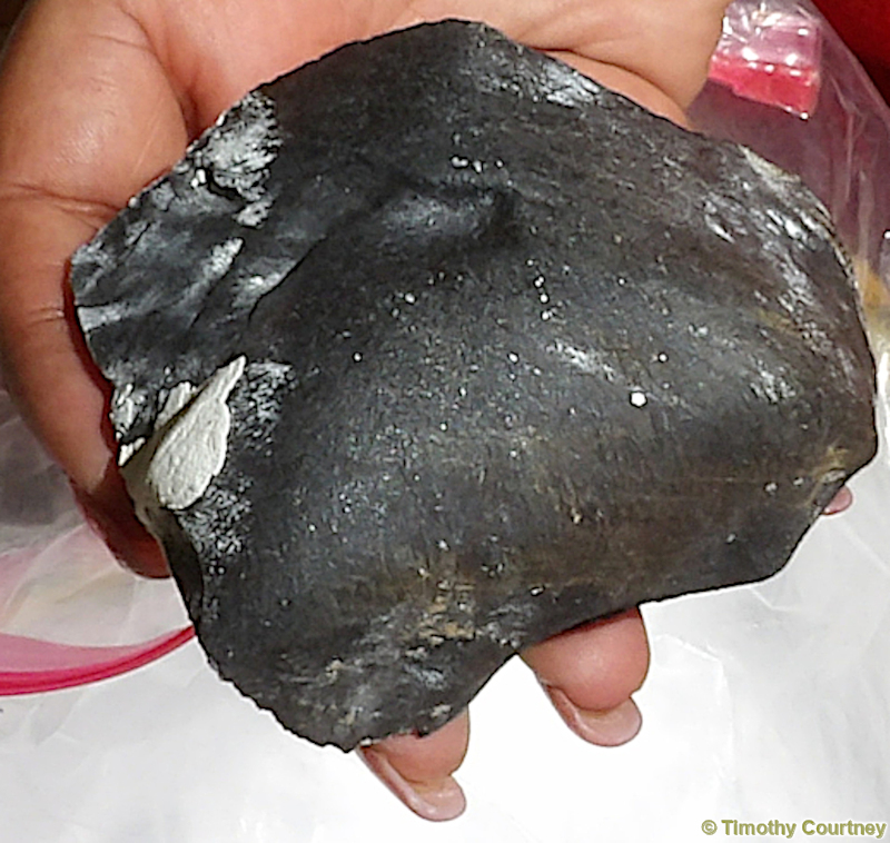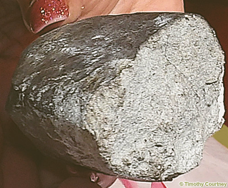 Sherrie James holds the meteorite and displays the core of the rock. It was a gray sand like material which all appeared compressed together as tightly as possible. Here, you see just how thin the burnt crust layer is. It was very heavy for a relatively small object, estimated to weigh atleast five pounds.